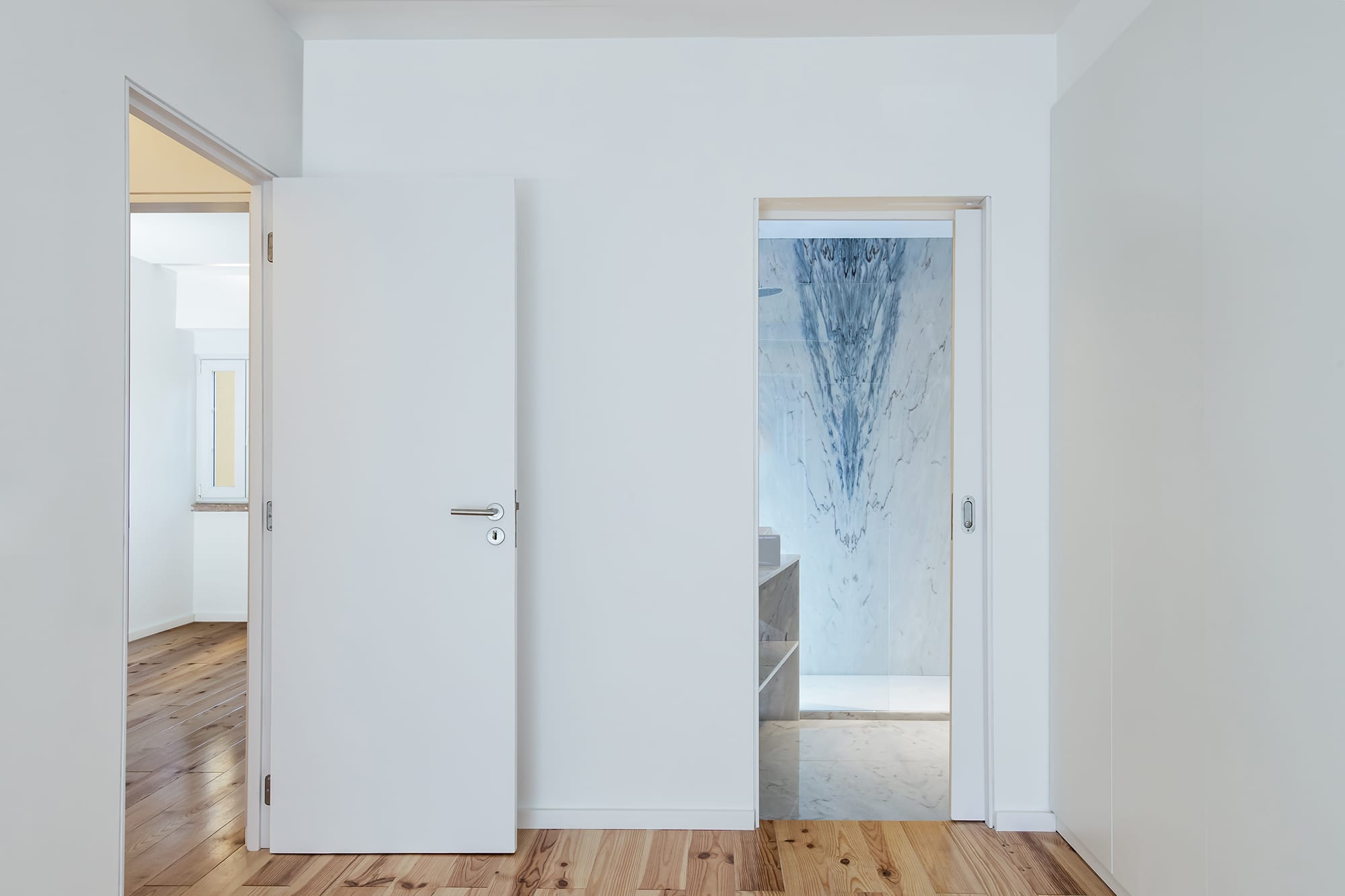 O Apartamento em Caxias localiza-se numa das zonas mais antigas de Oeiras, junto ao Convento da Cartuxa. No início do século XX, o Convento albergou as instalações do Instituto Padre António de Oliveira. Caxias preservou algumas qualidades específicas desse tempo, ao ser dos lugares menos afetados pela pressão urbana sobre Oeiras nas décadas de 50, 60 e 70. O Projeto propõe um espaço social amplo, valorizando e luz e a espacialidade, com a cozinha aberta para a sala destacada com iluminação indireta. Madeira de pinho e Mármore de Estremoz são os elementos predominantes que trazem nobreza ao espaço, contrastando com o branco das paredes que reflete a luz natural, iluminando assim a divisão. O Projeto é uma declaração de Arquitetura Moderna, com espaços amplos, desenhados com a sua funcionalidade em mente. O desafio foi realizar a obra em plena pandemia tal responsabilidade apenas se tornou possível graças a uma equipa altamente qualificada, cujos projetos são levados a cabo pela sua própria mão de obra, gerida por Arquitetos e Engenheiros.