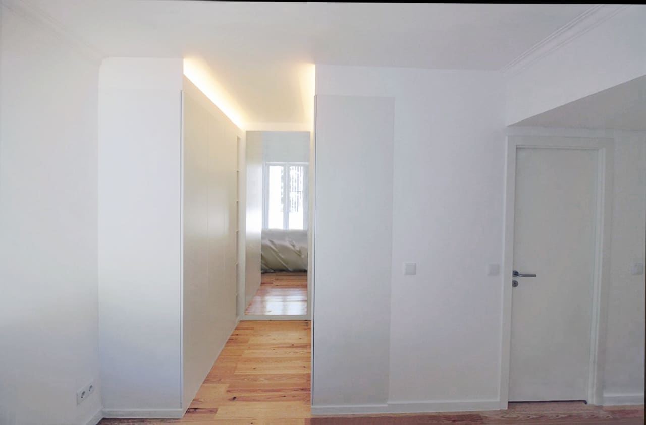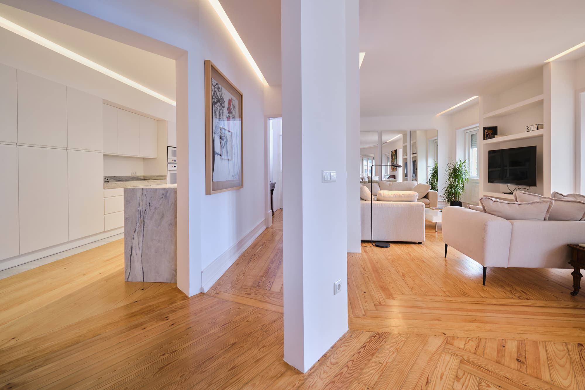 Situado no centro de Lisboa, a Rua Bernardim Ribeiro respira da centralidade dos bairros habitacionais que se construíam no início do Século XX, neste caso a Avenida da Liberdade, uma das principais avenidas de Lisboa, vai desde a Praça do Marquês de Pombal aos Restauradores. A CVZ Construções recebeu o convite para executar esta remodelação total. Uma equipa empreendedora e qualificada, na qual os projetos são executados pela sua própria mão de obra, gerida por Arquitetos e Engenheiros, iniciou a obra em pleno plano de contingência do governo contra a pandemia da COVID -19. O que se tornou num desafio ainda mais interessante acrescido pelo método construtivo do edifício do início do século XX, que é definido com paredes estruturantes exteriores em alvenaria de pedra e interiores em madeira, soalho de pinho assente em respetiva estrutura de barrotes de madeira, terminada pelo teto em gesso. A obra desenvolveu-se com muita prudência e mestria, que envolveu uma extensa colaboração entre a equipa Projetista e a equipa de Apoio de Preparação e Direção de Obra da CVZ Construções. A nova espacialidade obtida, torna o piso 1 numa zona privada mais intimista. Limitada pela escadas em madeira maciça, respondendo assim às novas exigências do habitar, espaços amplos híbridos com mais luminosidade. A memória da intervenção é definida pela materialidade do acabamento, mais especificamente a madeira de pinho e a pedra, que era uma das características exemplares do Edifício e das Frações originais. O resultado final resulta num apartamento que se abre à cidade. Cria-se uma nova alma urbana com a entrada de luz pela fachada principal na zona social, que com a demolição de paredes interiores antigas, permitiu uma nova espacialidade ampla. Lisboa está na moda, A capital está a ganhar nobreza. Denota-se o regresso da população ao seu centro e a CVZ Construções enquadra-se no mesmo movimento ao realizar obras de remodelação deste âmbito.